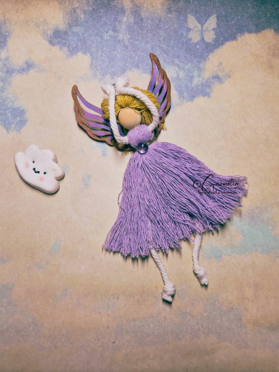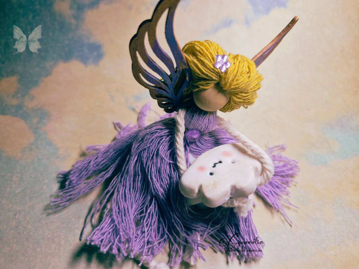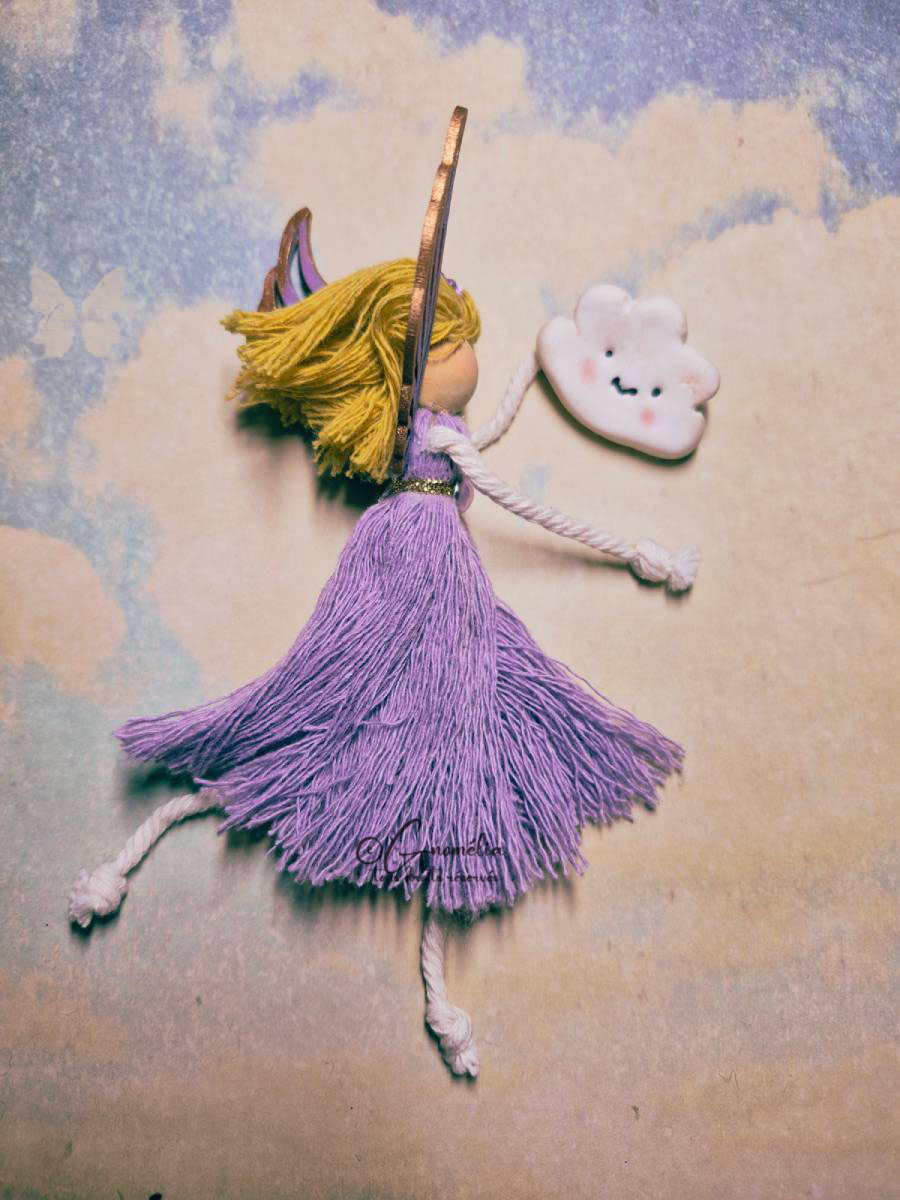 Alors qu’elle n’était qu’une jeune fée, elle trouva un petit fragment de brume égaré, tremblant de froid après un orage. Elle l’enveloppa de ses mains, lui chanta sa toute première mélodie, et le petit nuage s’illumina d’une lueur joyeuse. Elle le nomma Nimbus, et depuis ce jour, ils ne se quittent plus.